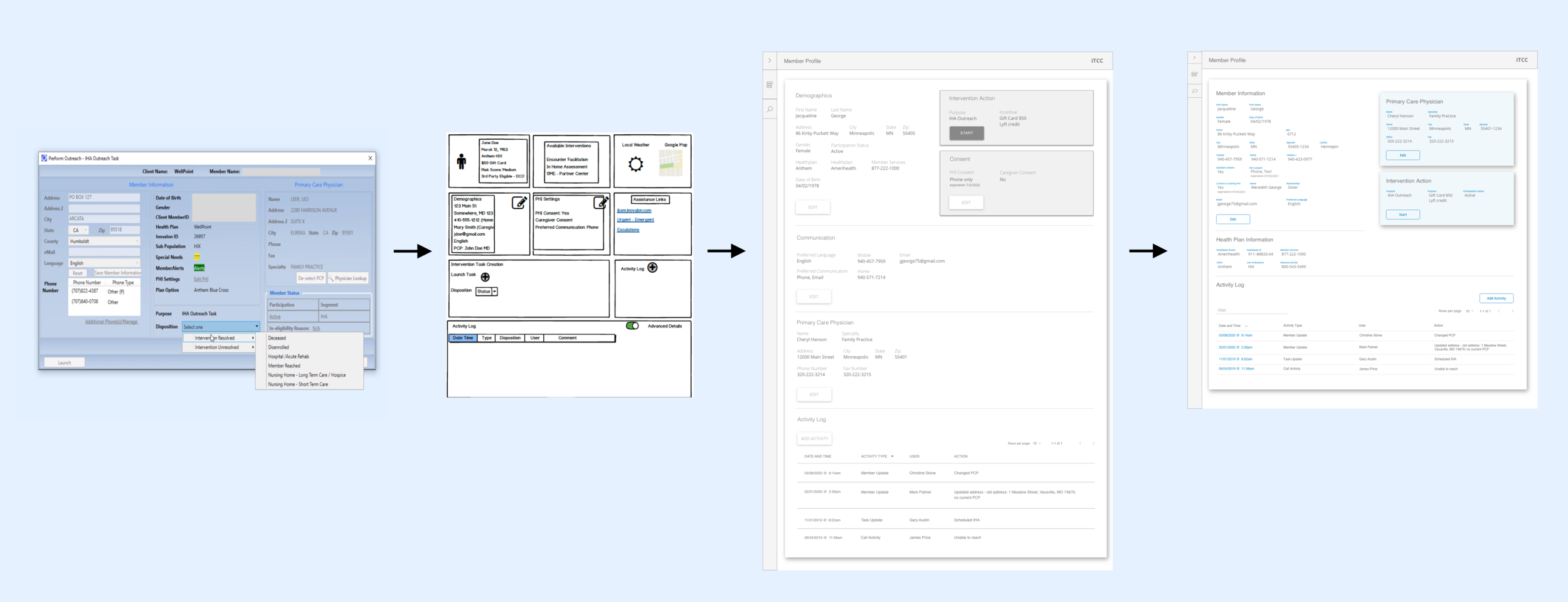 Internal call center application used to schedule medical assessments had accumulated features over a decade without considering user experience. Aging tabbed interface required agents to navigate to different tabs for every action, limiting assessment scheduling capacity and productivity.